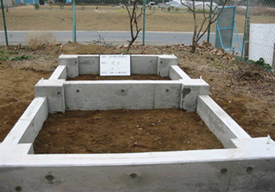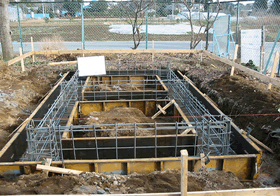 仮枠→鉄筋→ベースコンクリート打ち→型枠→基礎コンクリート打ち→