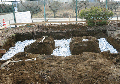 礎の大きさに穴を掘り、一番下に大き目の石を敷き詰めます。